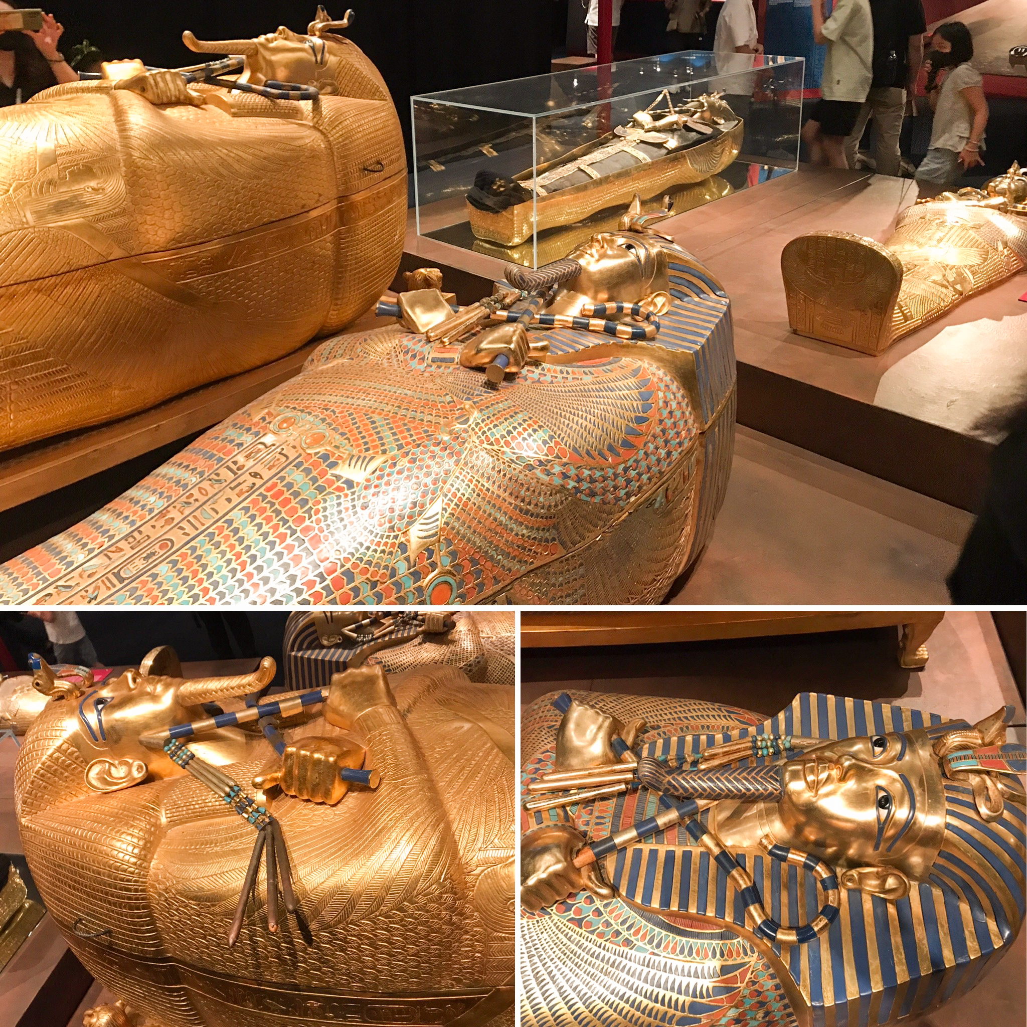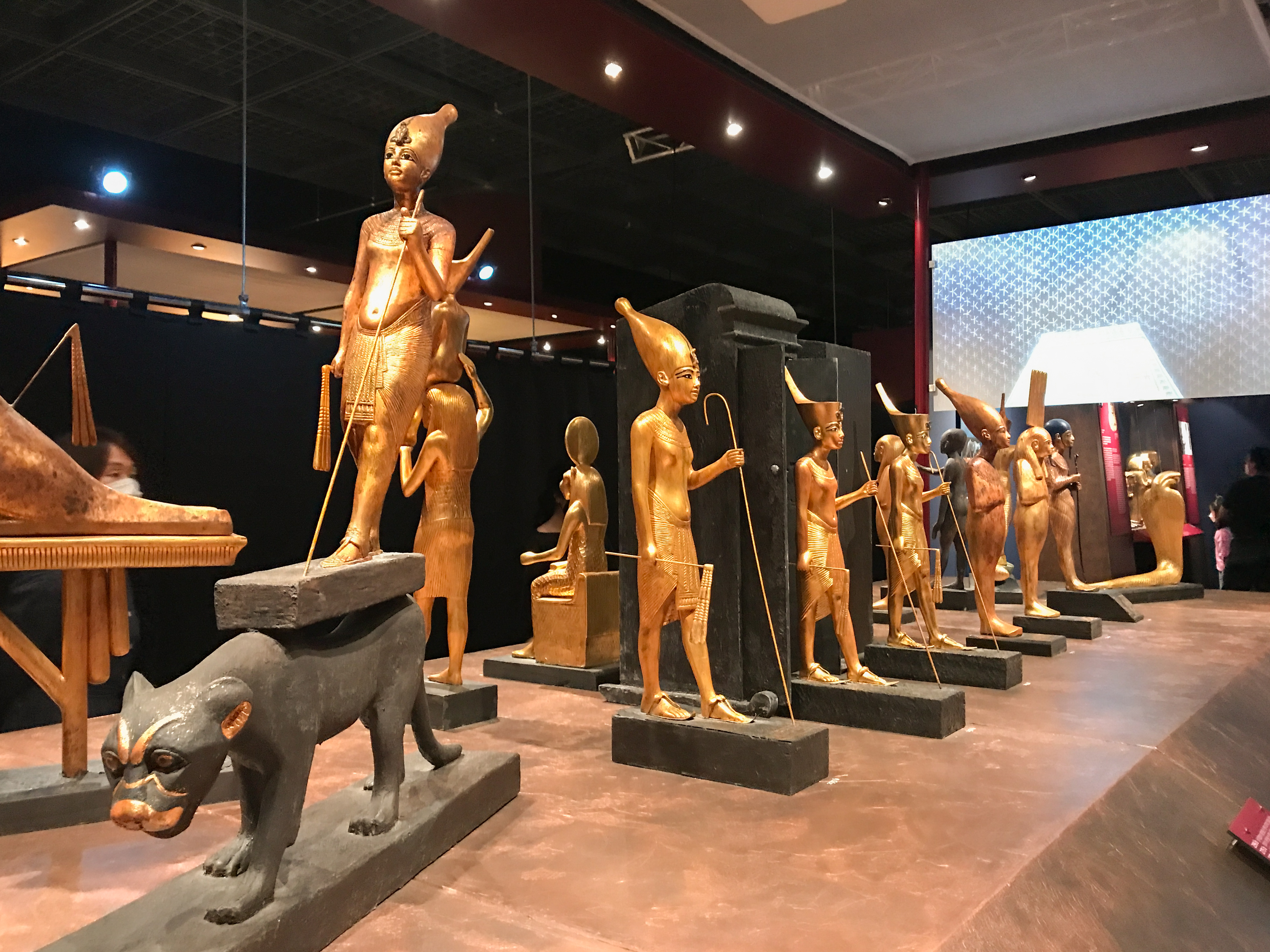 이 밖에서도 무덤에서 출토된 가구, 옷, 전차, 무기 등 살아생전 파라오가 쓰던 물건들이 전시되어 있는데요. 대형 황금 전차와 발 받침대가 있는 황금 왕좌, 황금 손가락·발가락 감싸게, 발길이 299㎜의 황금 샌들, 도금된 온갖 신상들이 시선을 사로잡아요.