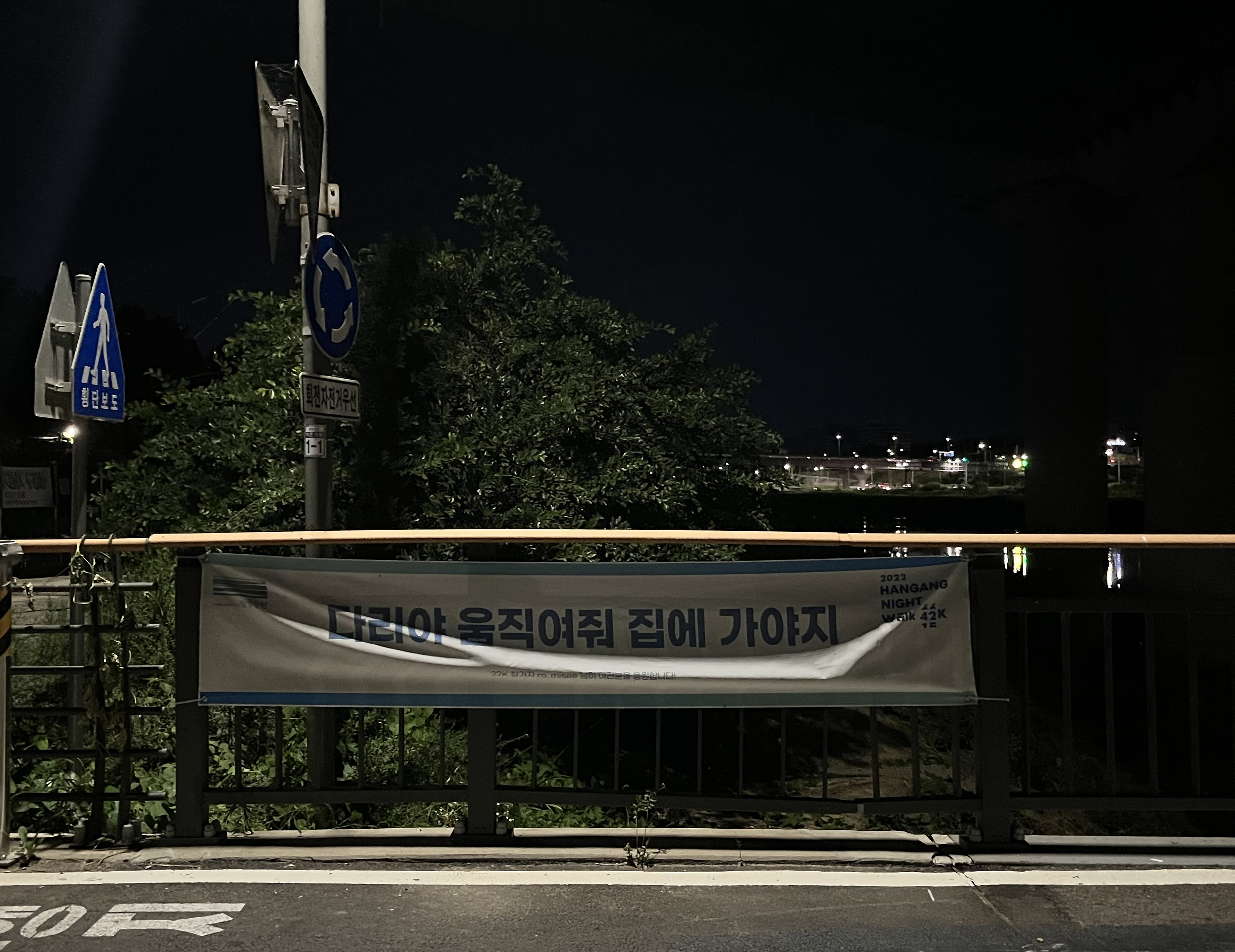 여름 날씨인 요즘은 겨울보다 날이 늦게 저물기 때문에 저녁 7시 30분~8시 사이면 점점 어둑해지기 시작해요. 7시에 시작해서 약 1시간 정도 걷다 보니 슬슬 땅거미가 내려앉았습니다. 걷다 보면 2-3km마다 지금 몇키로 걸었다 이런 표지판이 눈에 띄게 붙어 있어서 내가 어느 정도 왔구나, 어느 정도 남았구나 페이스를 조절할 수 있어요. 저녁 6시에 시작해 새벽 내내 걷는 무박 2일 한강 나이트 워크! 더위를 피해 저녁에 한강을 걸으면서도, 함께 걷는 사람들이 많아 무섭지 않았습니다. 이 밤에 선선하게 한강을 따라 안전하게 걸을 수 있다는 것. 이게 좋아서 매년 사람들은 신청하는 게 아닐까요?