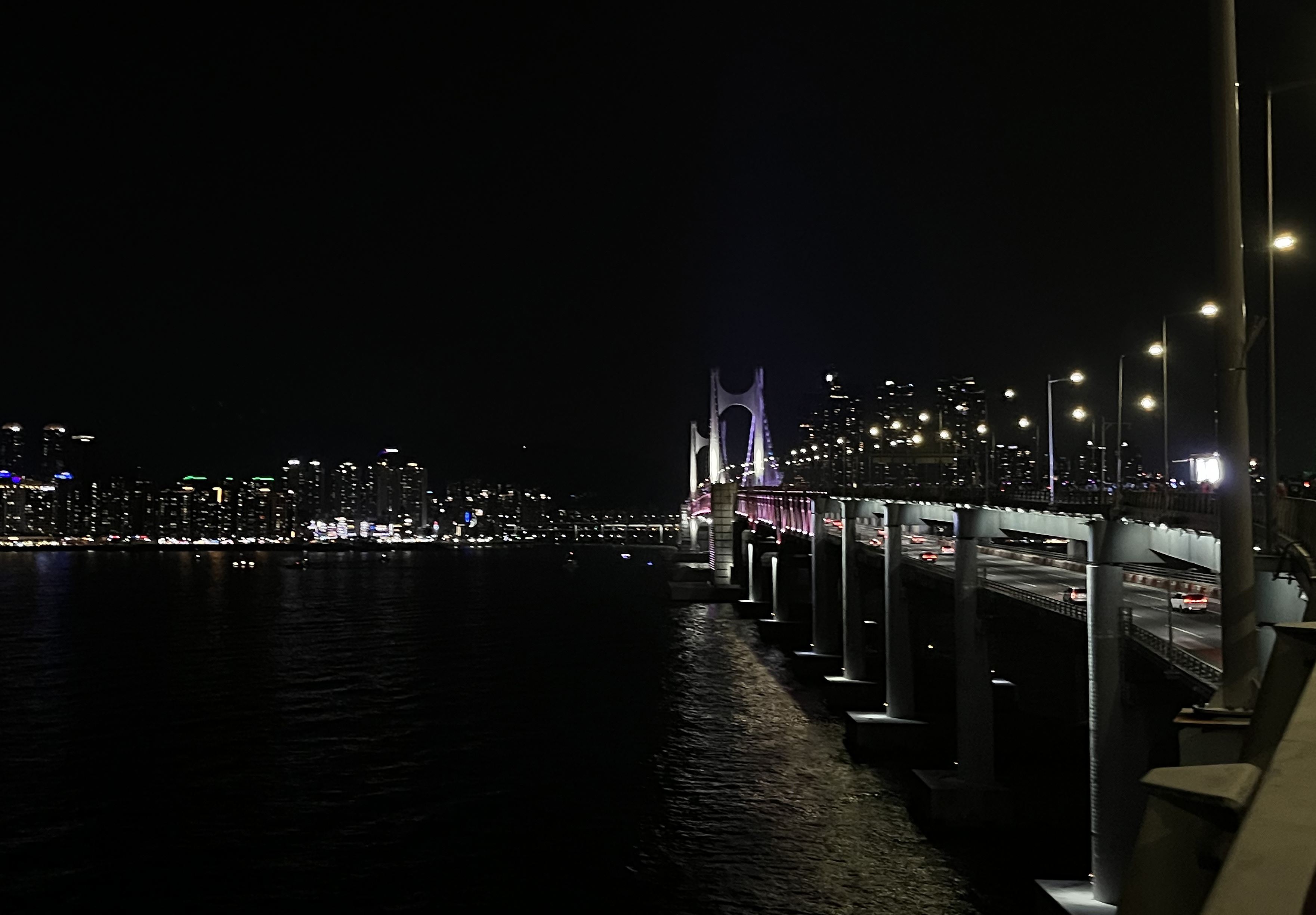 한강나이트워크에서 걸었던 대교들은 도로 한 켠에 도보가 있어 평소에도 올라가 볼 수 있지만, 부산의 광안대교는 차량만이 다니는 다리였기 때문에 다리의 차량을 통제하고 사람만이 그 다리 위를 건너고 있다고 생각하니 짜릿했습니다. 평소에는 올라갈 일 없는 광직접 광안대교에 올라와 내려다보는 광안리 해변은 바닷가에서 대교를 바라볼 때와는 또 다른 시야를 보여줬어요. 광안리에는 매주 토요일 저녁, 드론 라이트쇼가 열리고 있어 까만 하늘에 갑자기 나타나 손을 흔드는 펭수도 마주할 수 있었습니다.