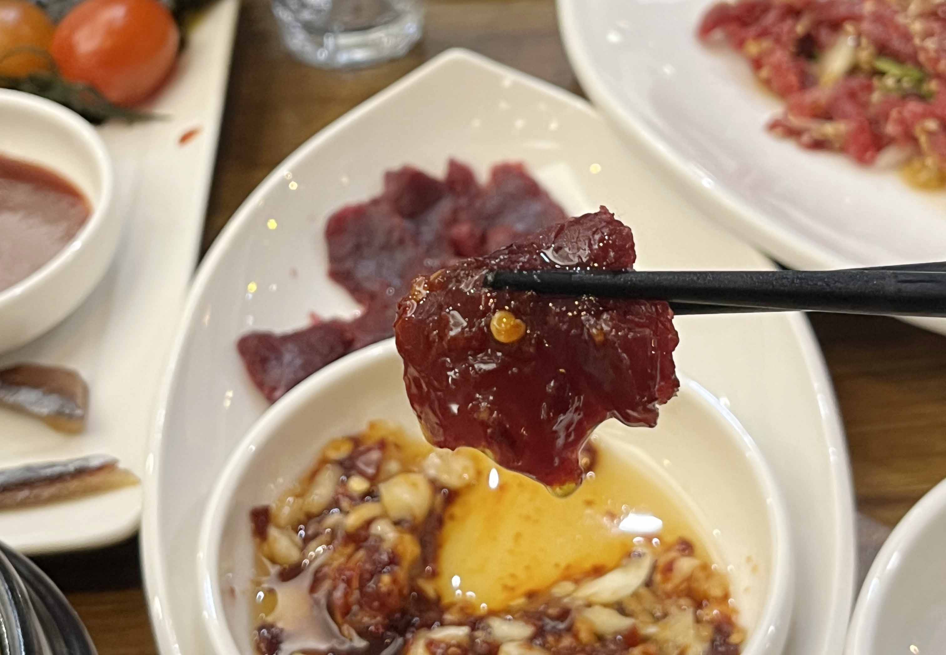 저는 인터불고 엑스코 호텔 근처의 새로 생긴 ‘홍시 생고기’를 방문했는데요. 사장님만의 20여년 비법이 담긴 막장 소스와 과메기, 신선한 천엽과 간, 명란젓 김밥, 다슬기, 족발과 나물 반찬 등 한상 가득 차려지는 밥상에 뭉티기를 다채롭게 즐길 수 있었습니다. 뭉티기(생고기)는 소진이 빠르게 된다고 하니 방문하시기 전에 꼭 전화로 확인해 보시는 걸 권장 드려요.