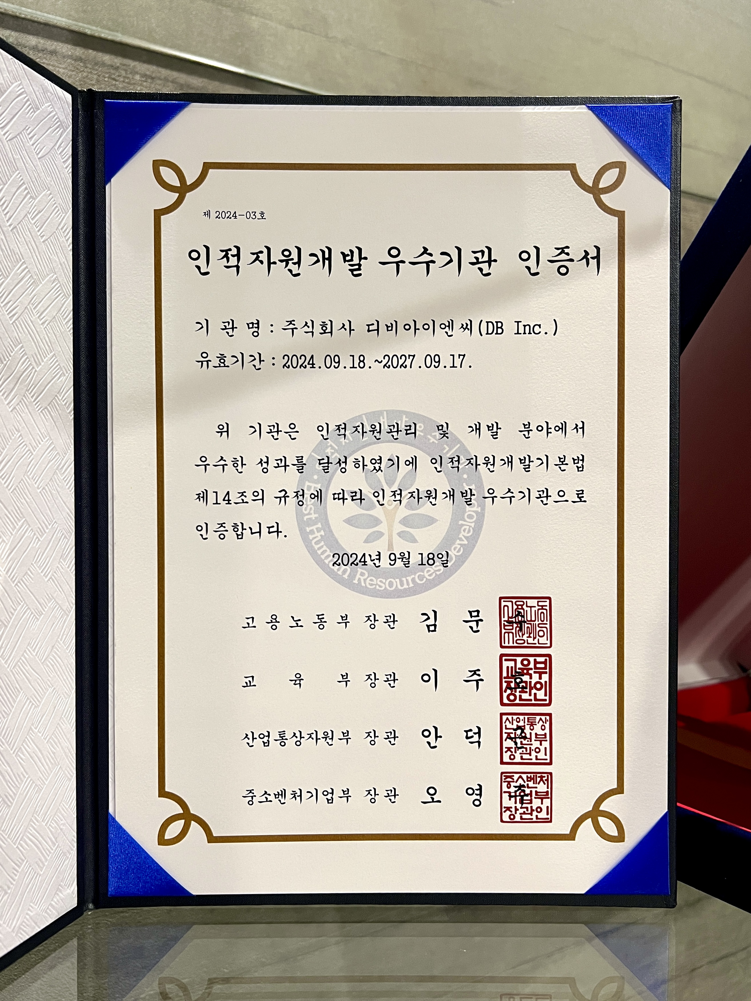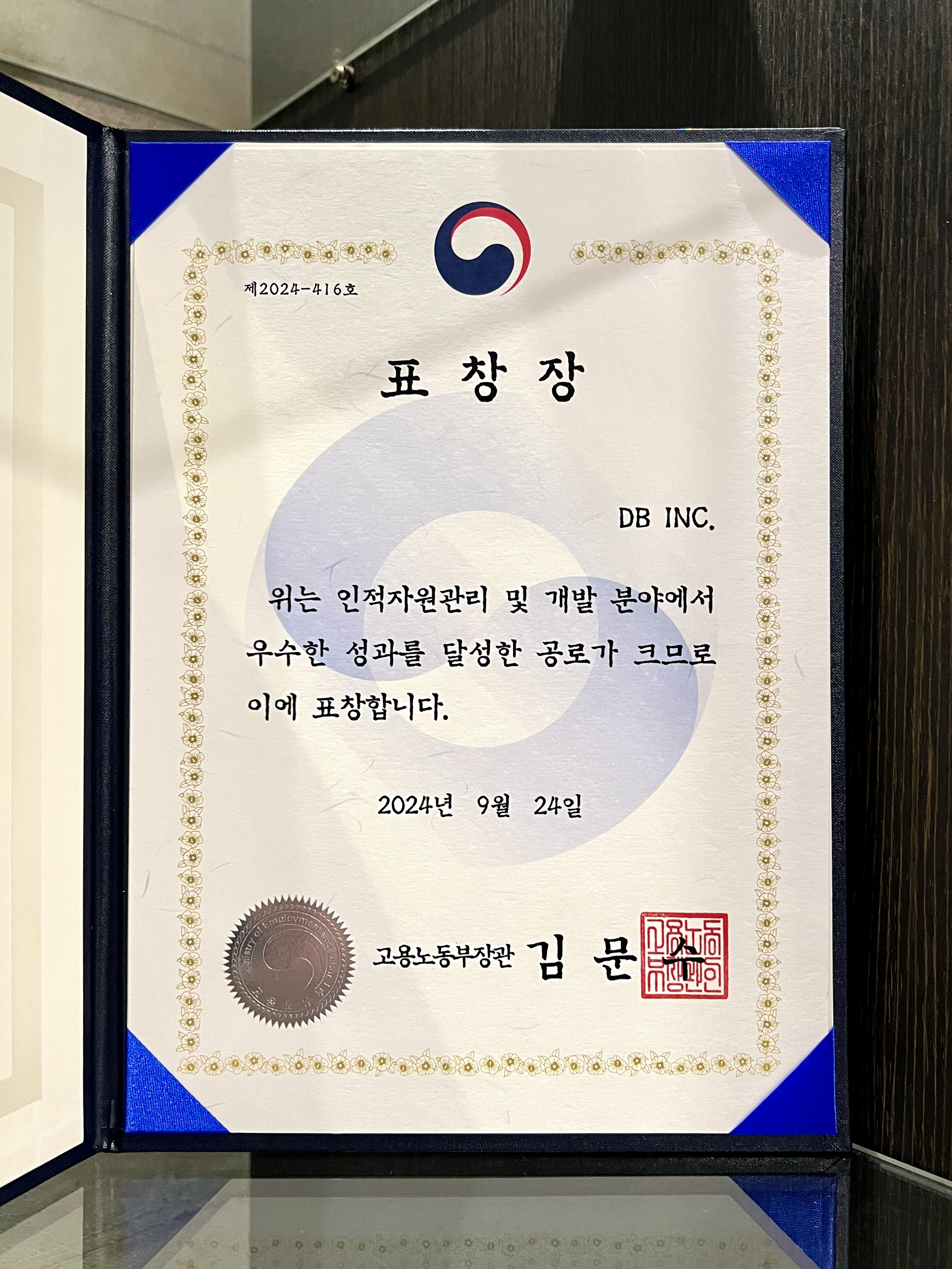 이러한 인적자원관리와 인적자원개발 노력이 높은 평가를 받아 DB Inc.는 지난 2024년 9월 24일 고용노동부와 한국산업인력공단이 서울 중구 대한상공회의소에서 개최한 '2024년 인적자원개발 우수기관 인증 수여식'에서 대기업 부문 최우수기업으로 선정돼 노동부장관 표창을 수상했다.