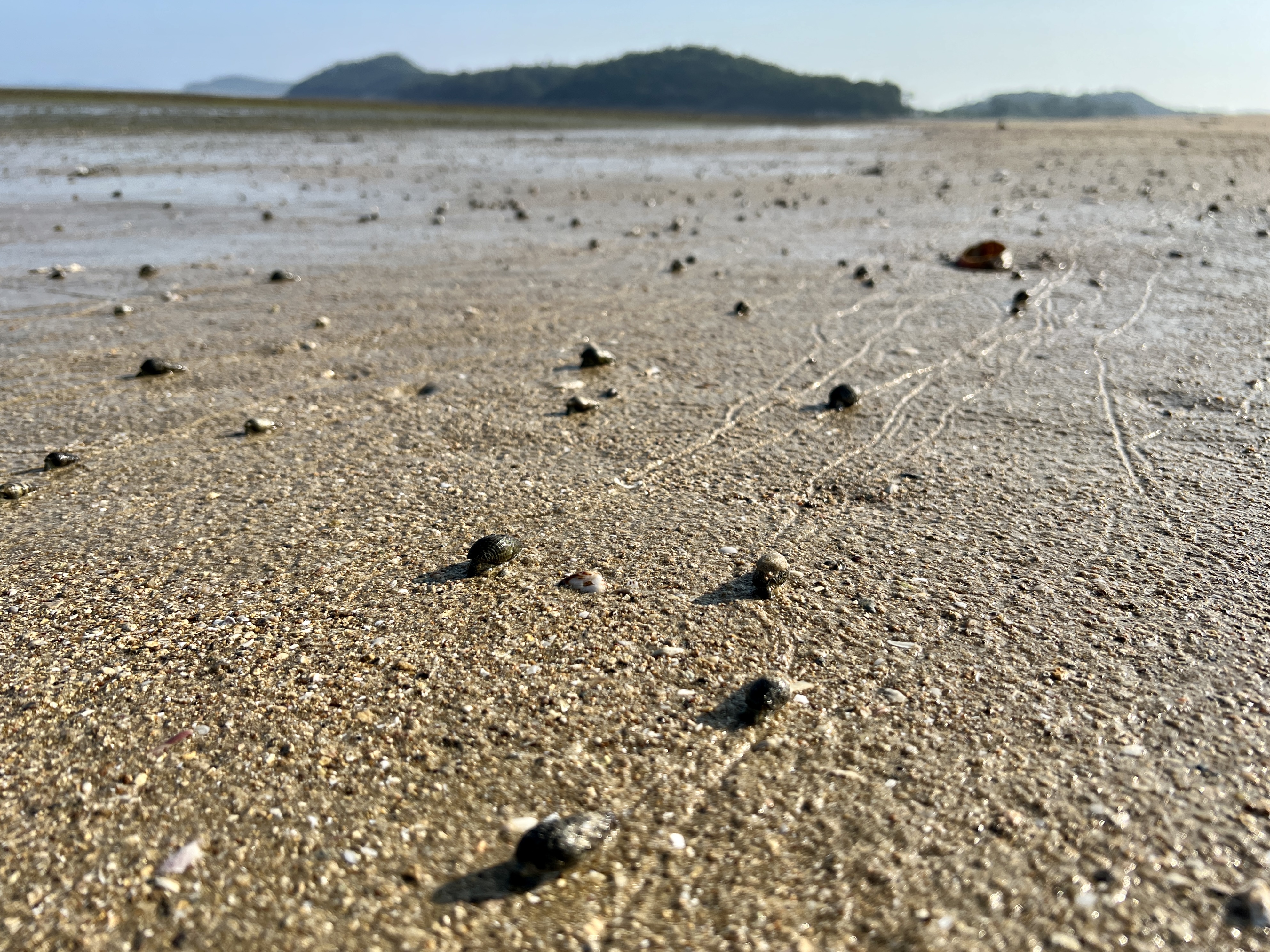 '사랑의 집'에서 대나무 숲길을 헤치고 돌아 들어가면 갑자기 바닷물이 빠진 모래 해변이 나타나요. 갯벌 너머로 그림 같은 딴섬이 보인답니다.