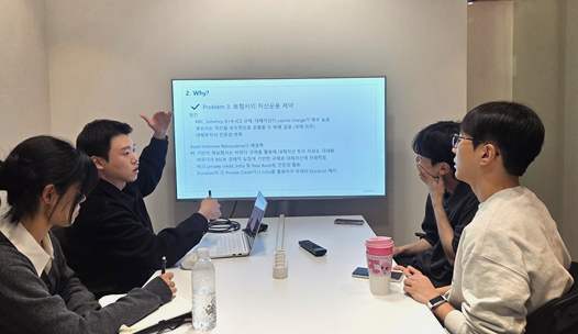 지난 11월에는 조별로 “자산집약적 재보험”, “100세시대 연금솔루션”, “기본자본 K-ICS 비율 현황과 전망”, “공동재보험의 이해와 향후 발전 방향” 등의 주제에 대해 발표하고 서로 질의했다.