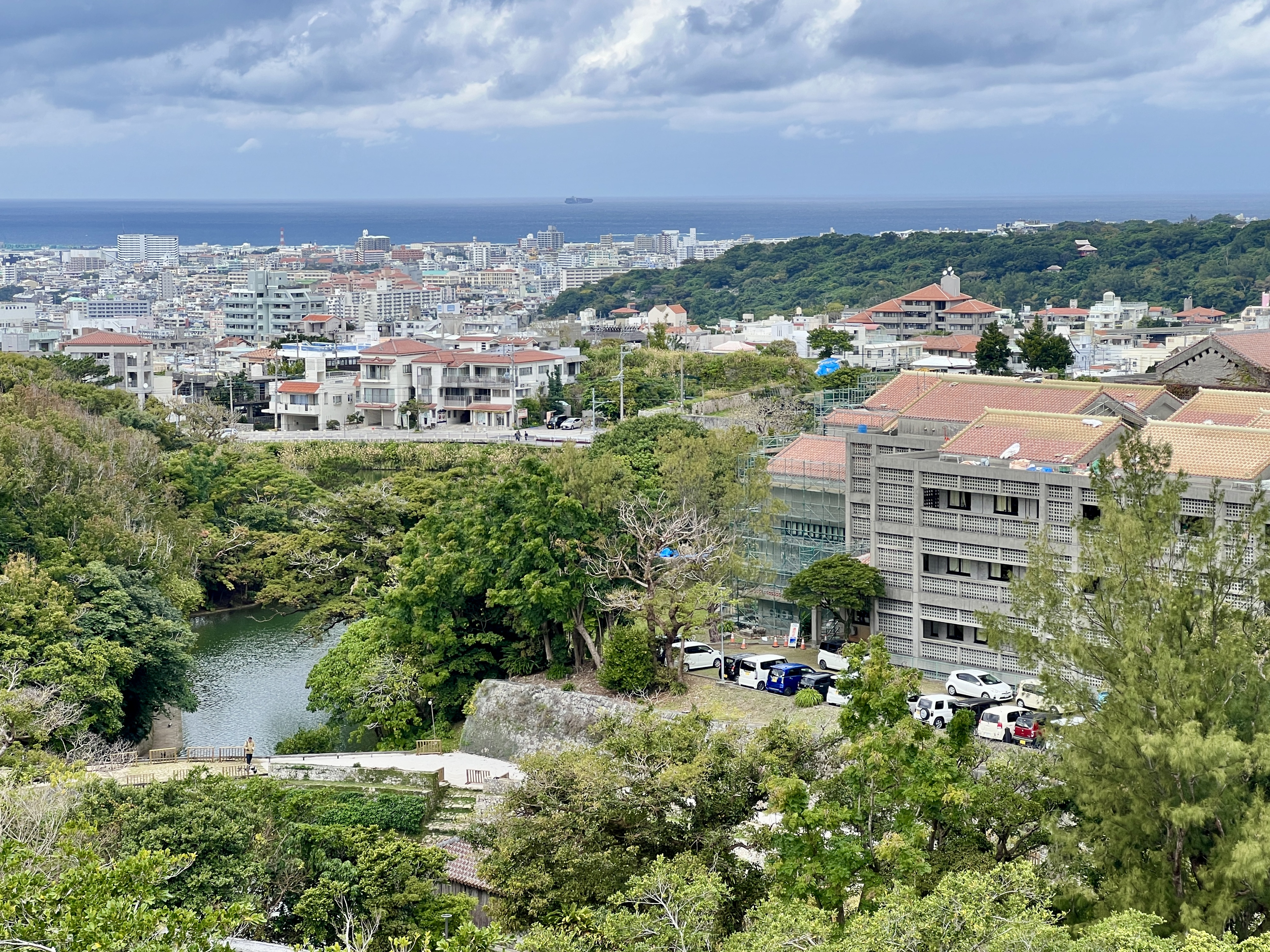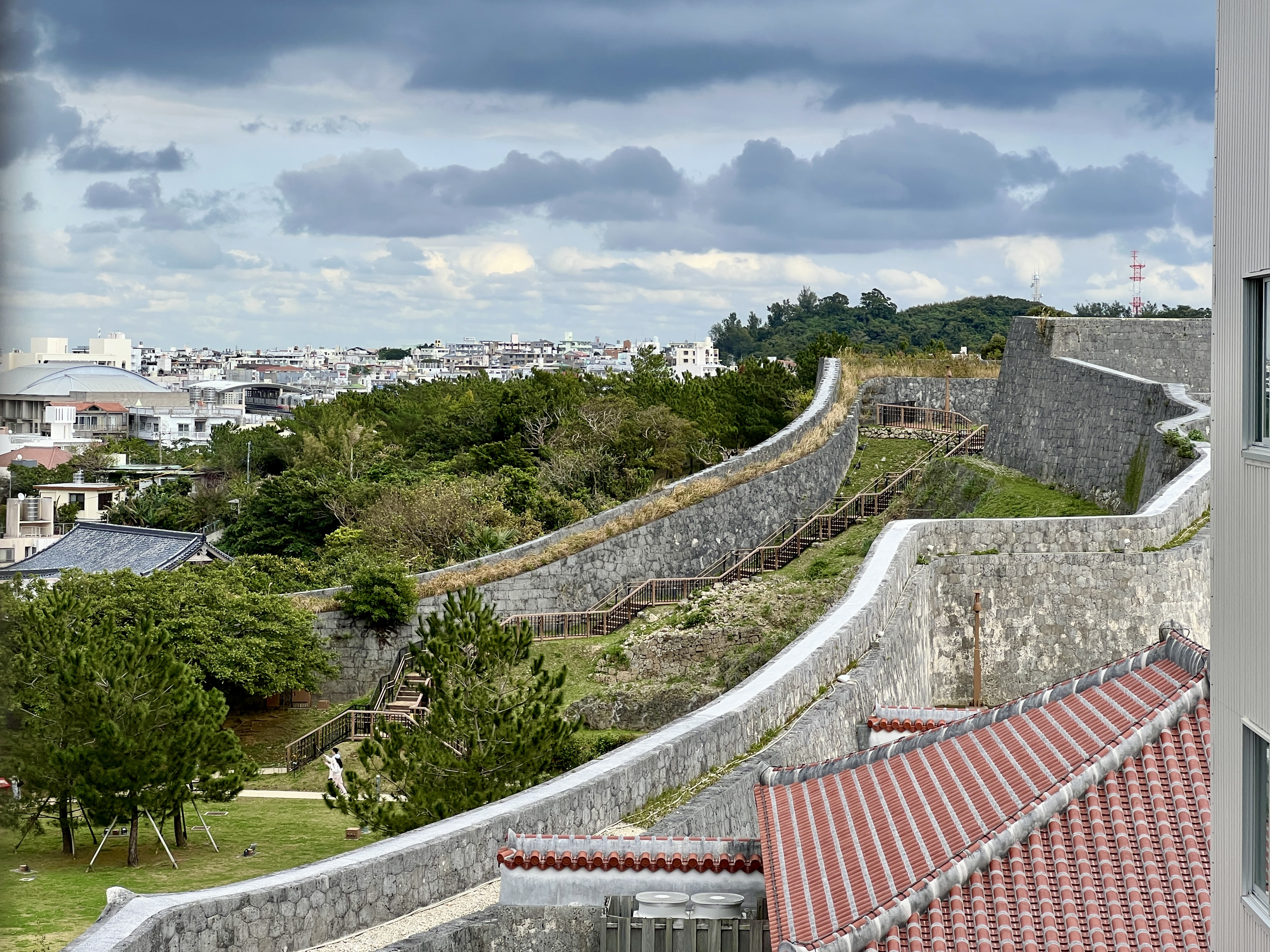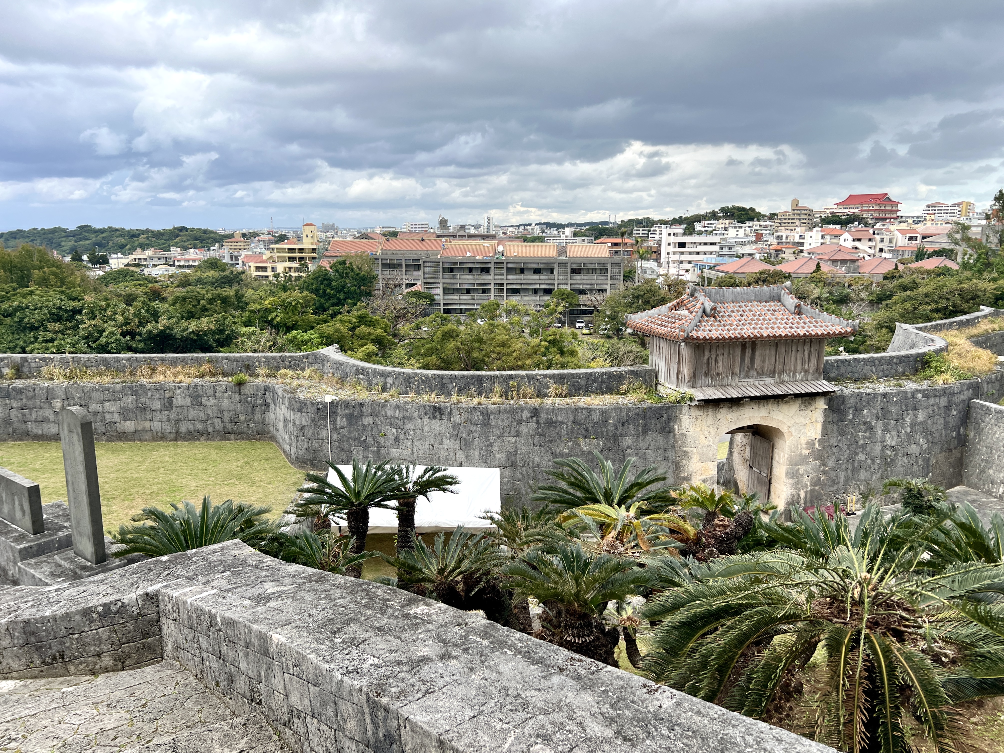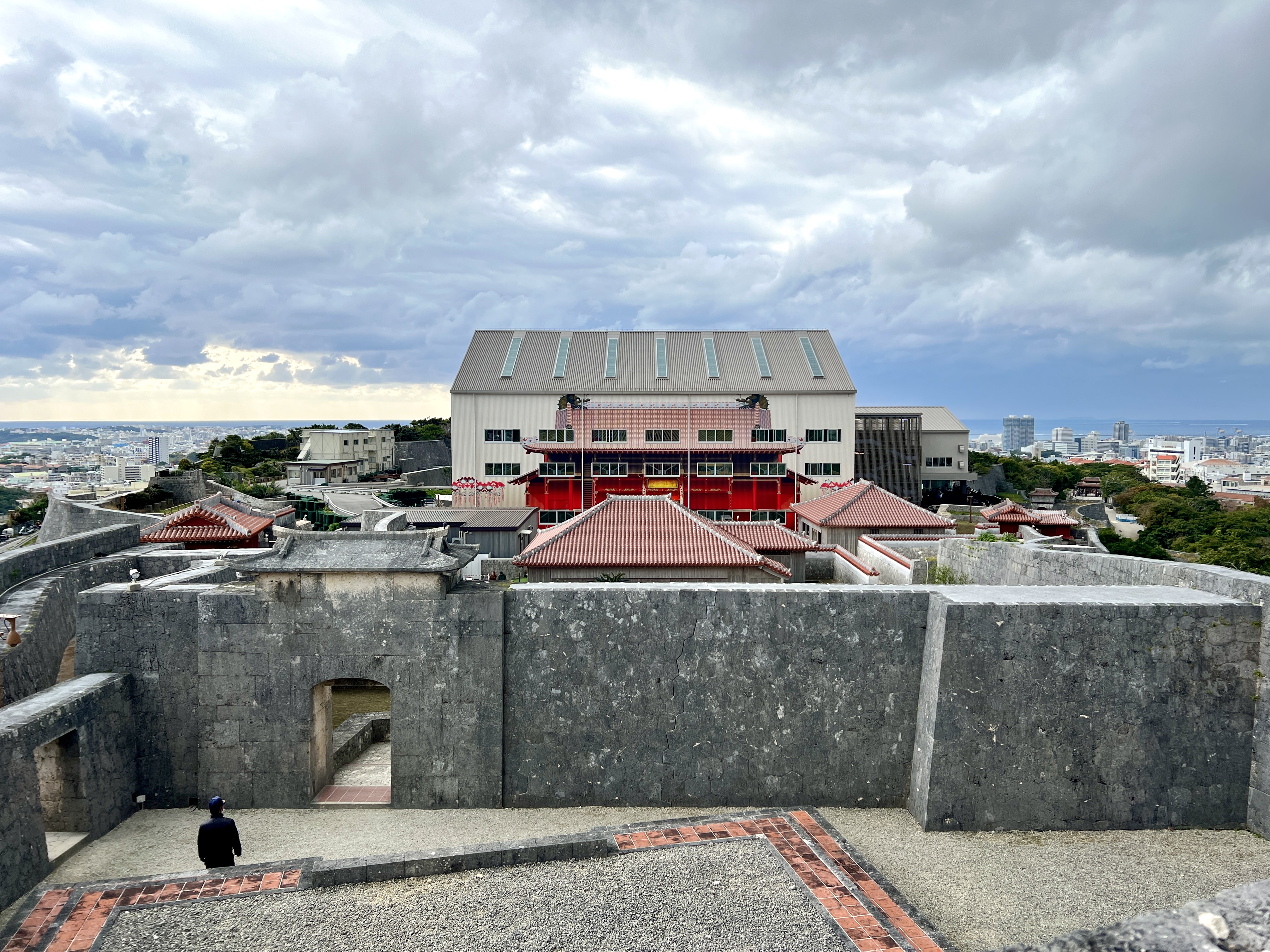 슈리성은 높은 언덕에 자리 잡고 있어 나하 도시가 한눈에 내려다보여요. 곡선을 그리듯 성벽에 둘러싸였고 그 안에 여러 시설이 세워져 있습니다.