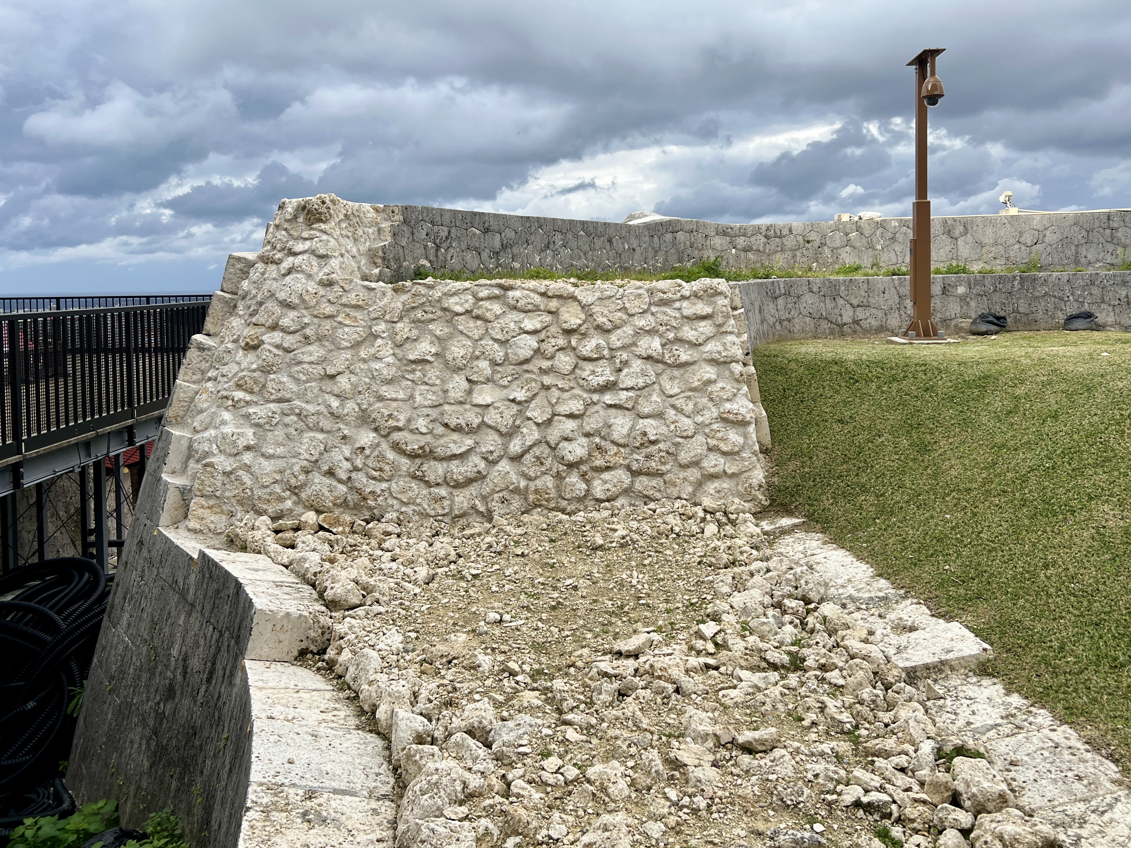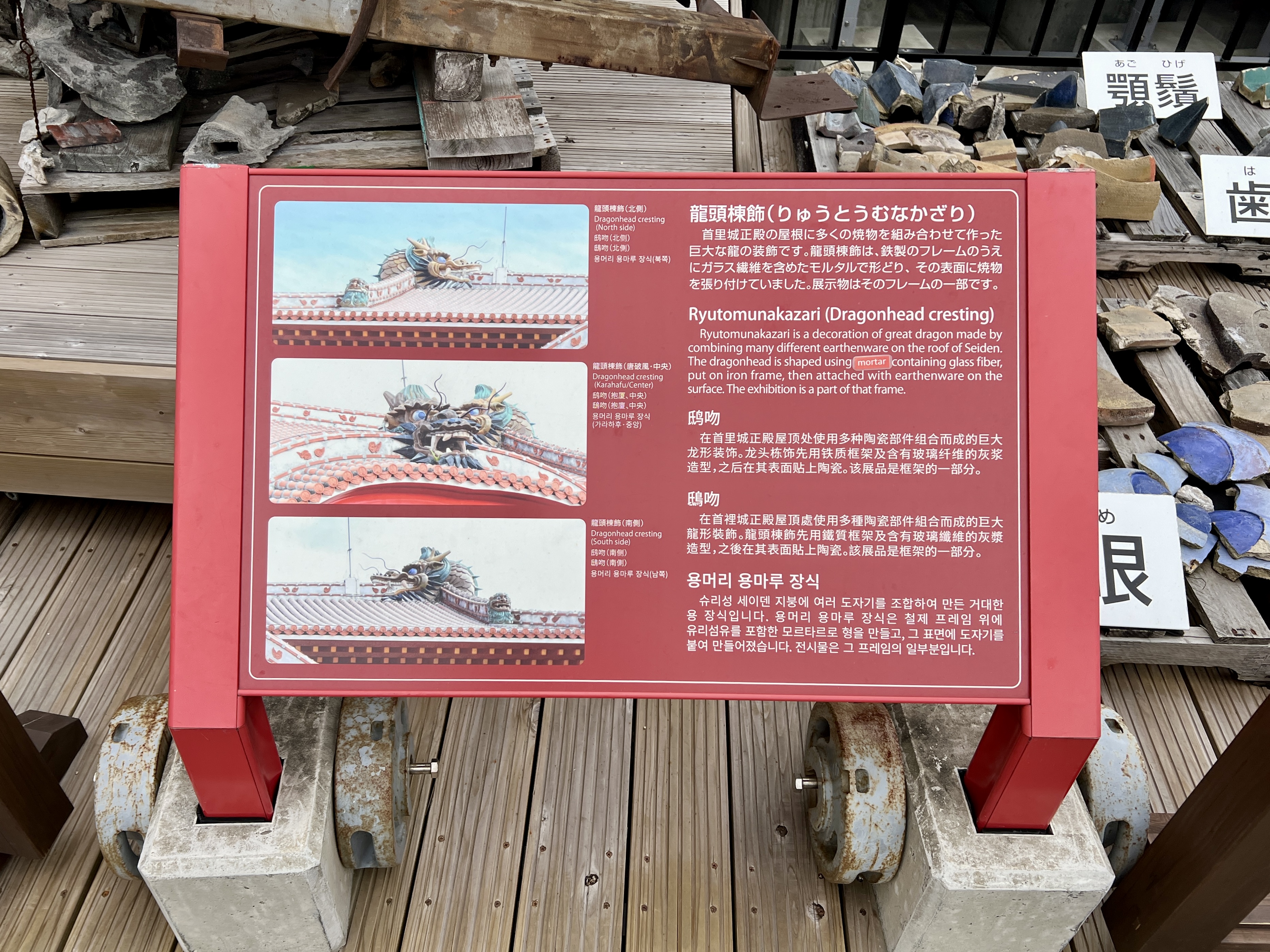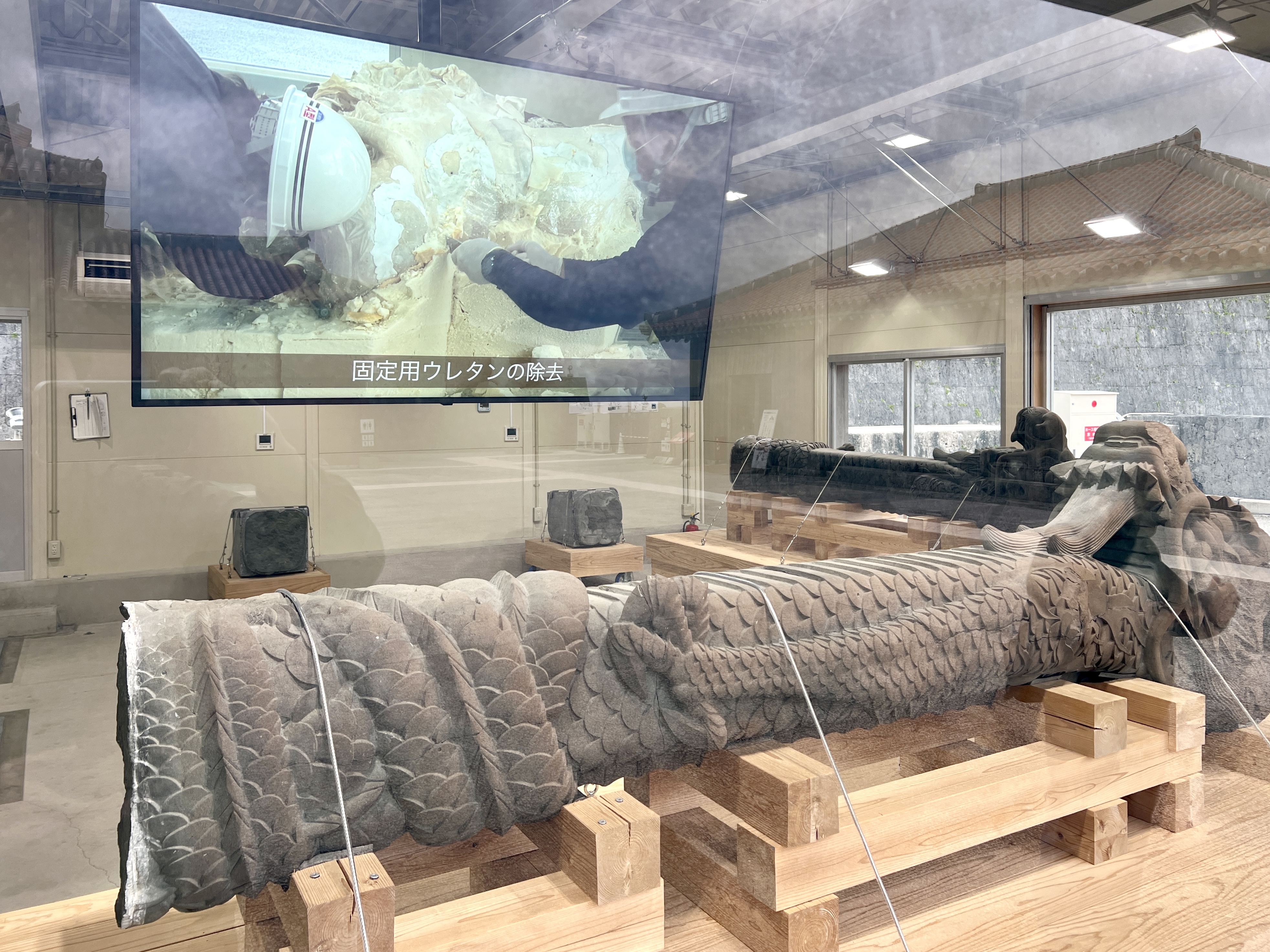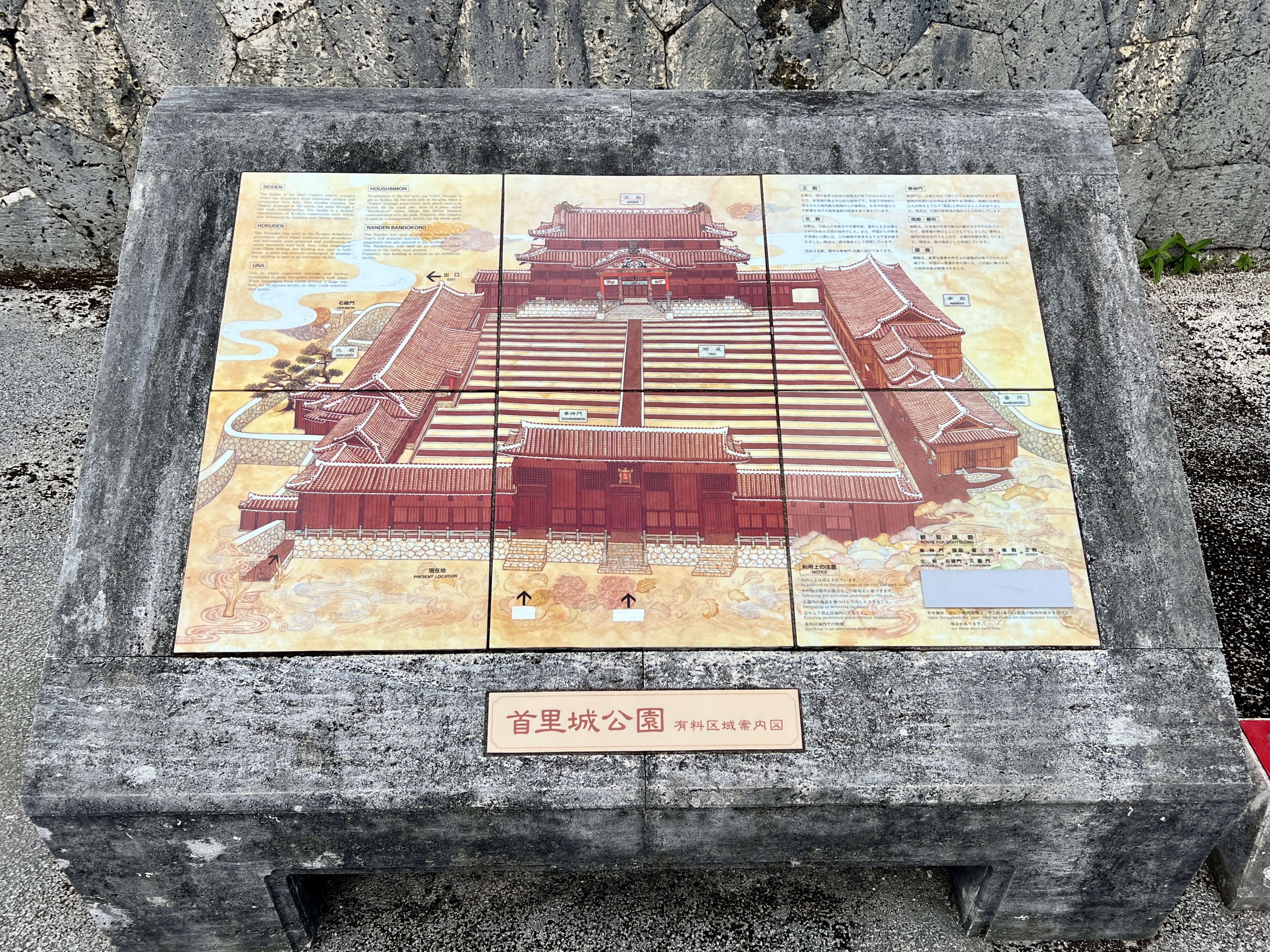 복원 현장에는 세이덴의 잔해들도 전시돼 있는데요. 세이덴 정면에는 오키나와 본섬의 세립사암으로 만들어진 ‘석고란(난간)’이 설치되어 있었고 지붕은 오키나와 특유의 붉은 기와로 덮여 있었다는 것을 알 수 있어요.