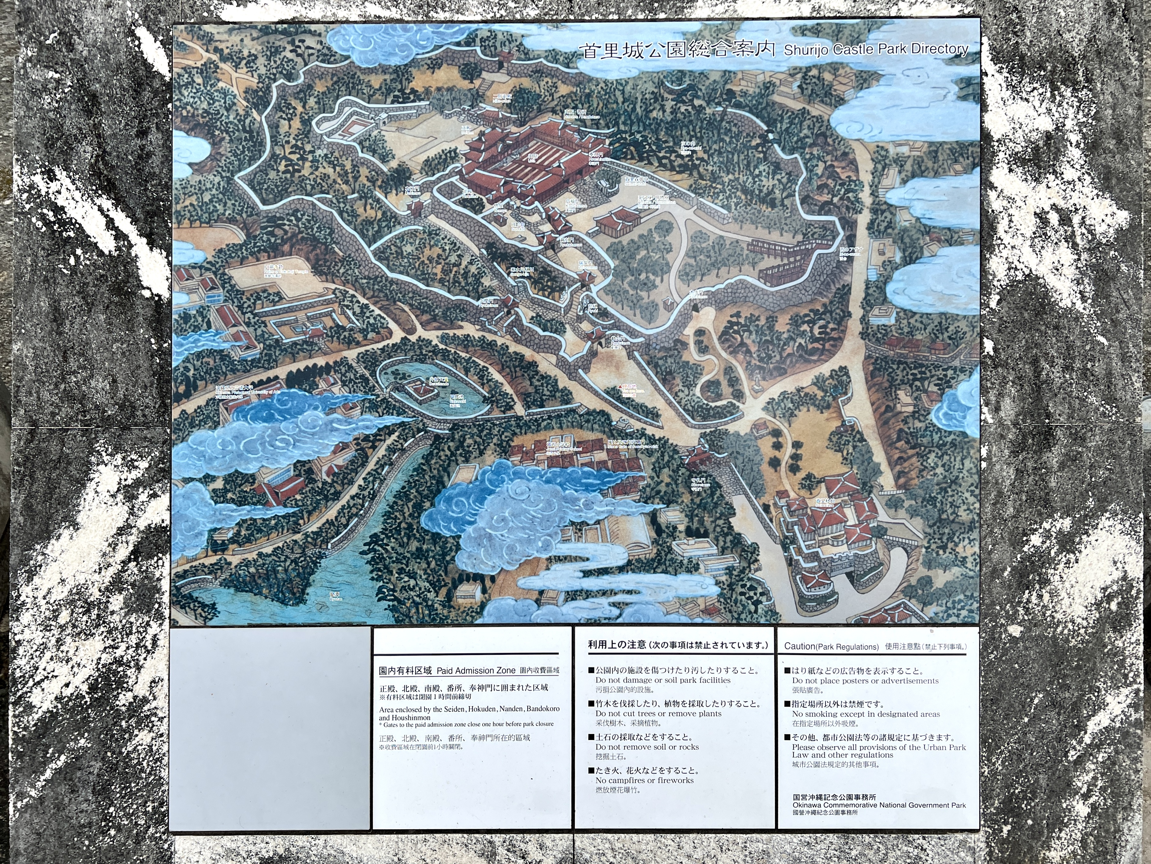 1945년 3월 말부터 단 3개월 동안 오키나와 전투에서 10만 명이 넘는 주민이 희생됐어요. ‘철의 폭풍’으로 불리는 공중폭격, 함포사격, 지상 전투의 총·포탄에 수많은 주민들이 쓰러졌고 슈리성도 파괴됐습니다. 전후 성터는 류큐대학 캠퍼스로 사용되다가 1992년 오키나와의 일본 복귀 20주년을 기념해 국영공원으로 복원됐습니다.