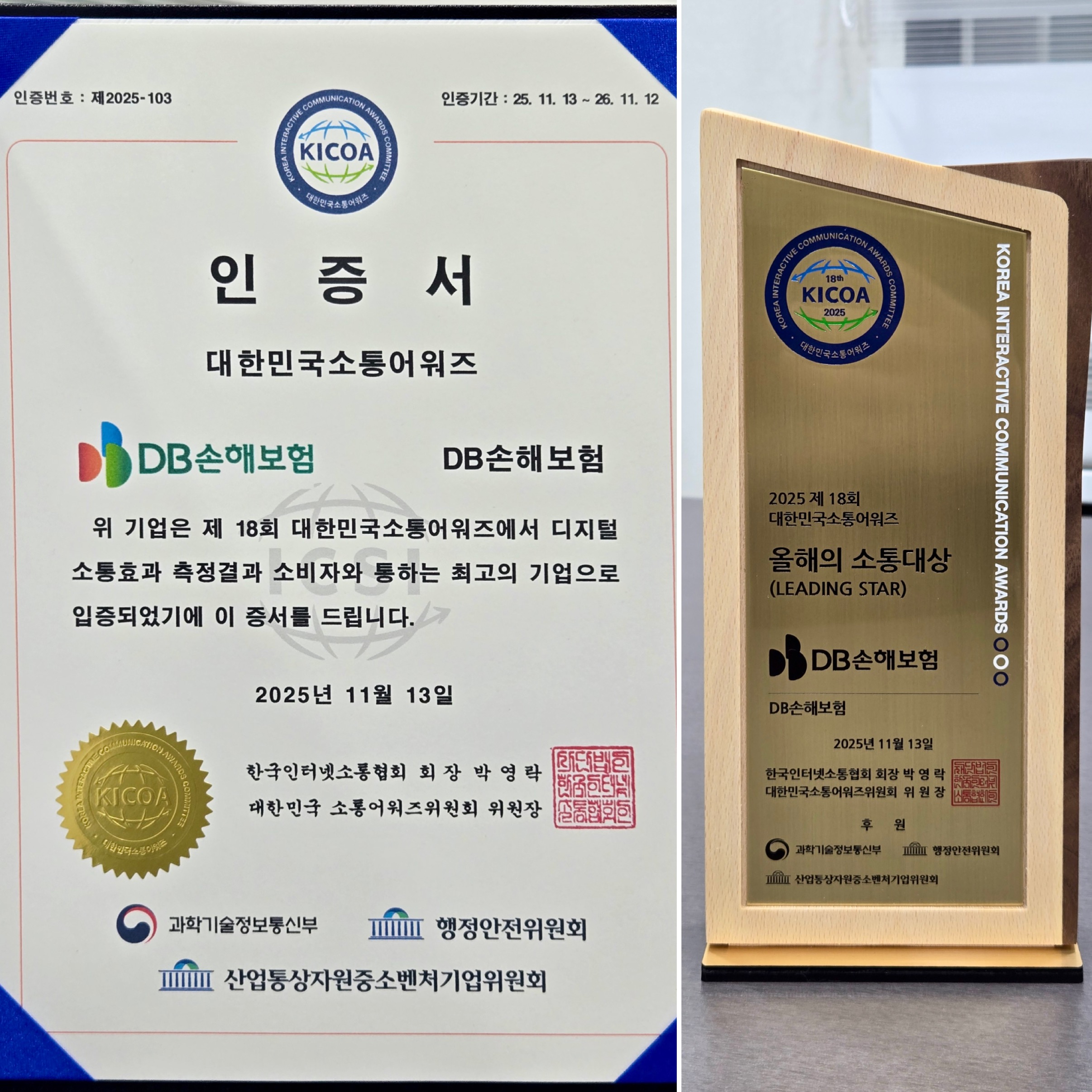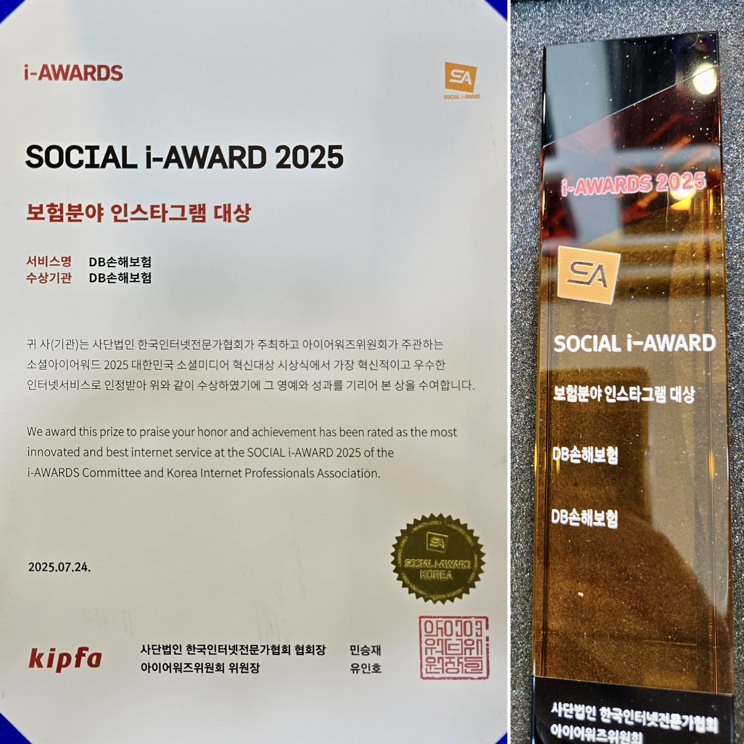 이런 노력이 쌓여 DB손해보험은 과학기술정보통신부 산하 (사)한국인터넷전문가협회가 주최하고, 아이어워즈위원회가 주관하는 국내 최대 규모의 2025 소셜아이어워드(소셜 인터넷 서비스 혁신대상)에서 '인스타그램 대상’을 수상했다.