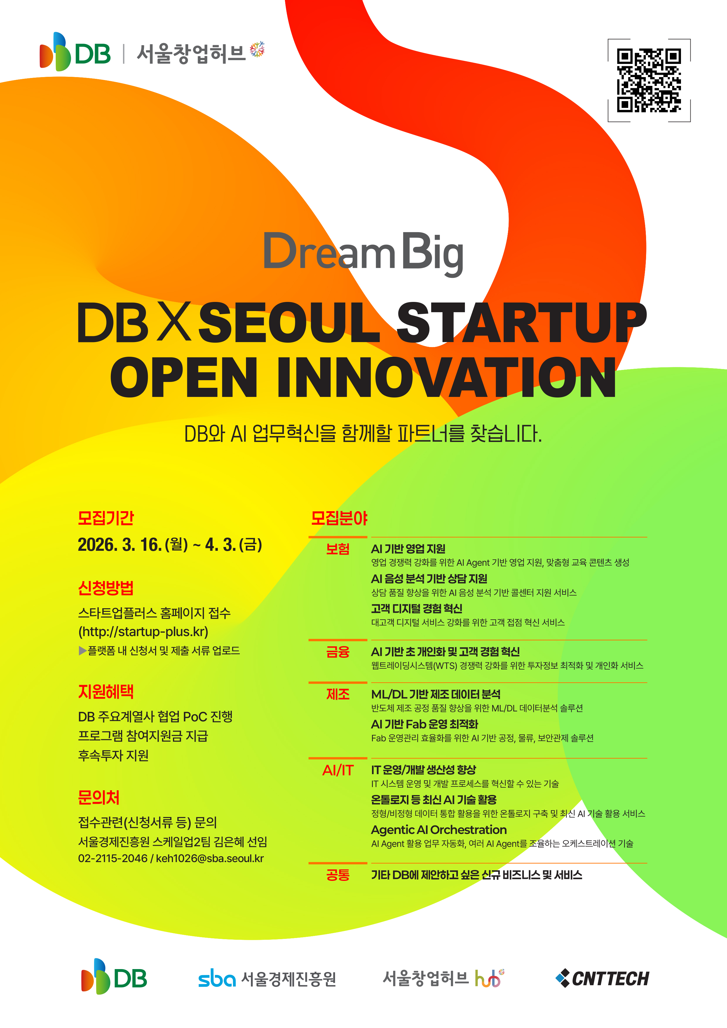주요 모집 분야는 △보험(AI 기반 영업 지원, 음성 분석 기반 상담 지원, 고객 경험 혁신) △금융(AI 기반 초개인화 및 고객 경험 혁신) △제조(ML·DL 기반 제조 데이터 분석, Fab 운영 최적화) △AI/IT (IT 운영·개발 생산성 향상, 온톨로지 등 최신 AI 기술 활용, Agentic AI 오케스트레이션) 등이다. 이 외에도 DB그룹의 AI 기반 업무혁신에 기여할 수 있는 혁신 기술과 서비스를 보유한 스타트업이라면 자유롭게 지원할 수 있다.